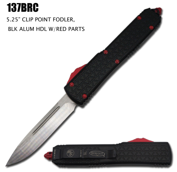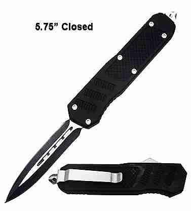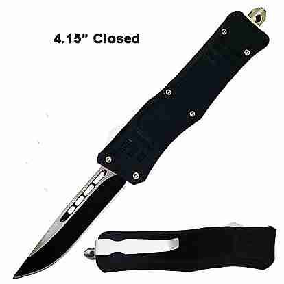 1918 US Black D/A OTF Trench Automatic Knuckle Knife Two Tone Dagger. Overall Length: 9 Inches Blade Length: 3.5 Inches Blade Material: 440 Stainless Steel, Powder coated black finish Blade Style: Dagger Handle Length: 6 Inches Handle Material: Cast metal, Heavy duty construction Includes: Pocket Clip, Glass breaker, belt sheath.